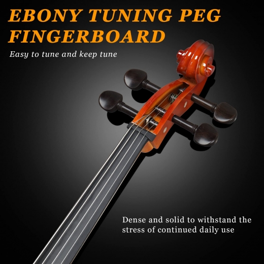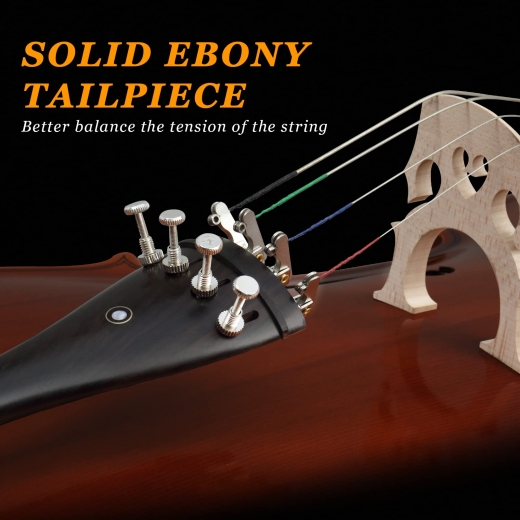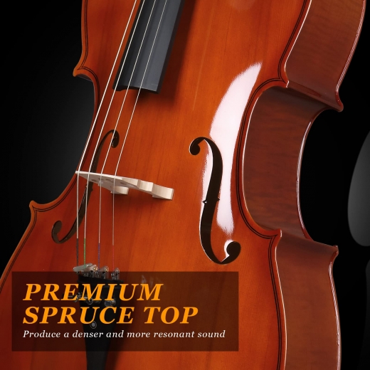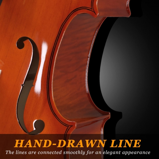Dieses Cello in voller Größe verfügt über eine massive Fichtendecke sowie Hals, Boden und Zargen aus Ahorn. Griffbrett und Saitenhalter bestehen aus Ebenholz. Sorgfältig von erfahrenen Handwerkern poliert und mit einem wunderschönen Lack versehen, besticht es durch einen perlmuttartigen, brillanten Glanz und bietet zugleich ein hervorragendes haptisches Erlebnis. Die nahtlose Verbindung der Korpuslinien verleiht dem Instrument eine elegante Ästhetik – ein echtes Kunstwerk.