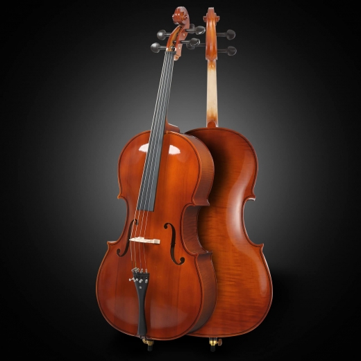 Die Decke des Cellos ist aus hochwertiger Fichte gefertigt, was für erhöhte Stabilität sorgt und einen dichteren, resonanteren Klang ermöglicht. Der Ahornboden mit seiner markanten Maserung verleiht dem Instrument nicht nur eine elegante Optik, sondern absorbiert auch effektiv Geräusche und reduziert die Schwingungsübertragung.