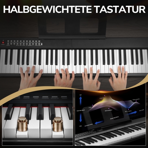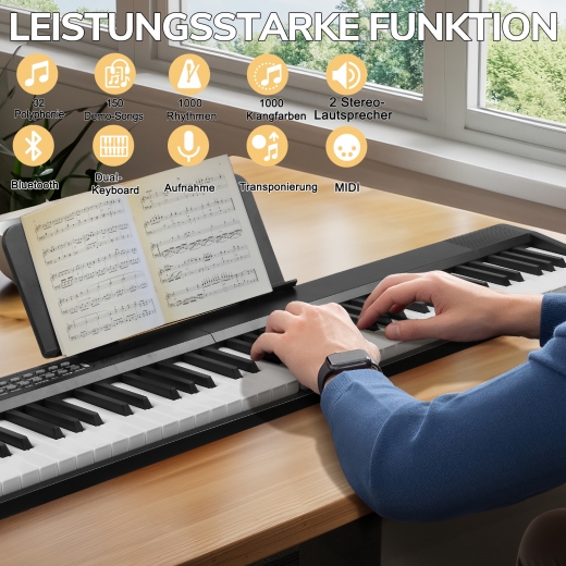 Glarry GPP-106 ist ein faltbares 88-Tasten-Digitalpiano mit halbgewichteten Tasten und hochwertiger Custom Dream Sound Source für beeindruckenden Klang. Bluetooth wird automatisch aktiviert – perfekt für kabellose Verbindung mit Piano-Apps. Ideal als Geschenk oder für Auftritte.